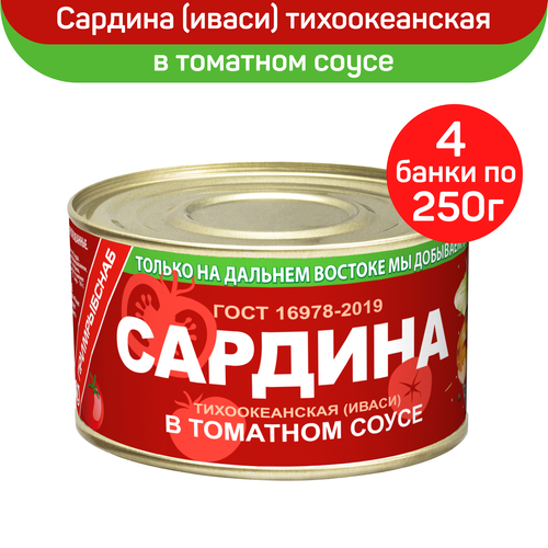 Консервы рыбные "Примрыбснаб" Сардина натуральная тихоокеанская иваси в томатном соусе ГОСТ, 4 шт по 250 г