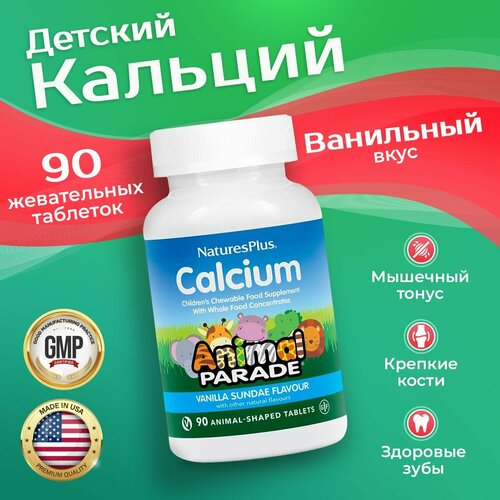 Детский Кальций со вкусом ванильного мороженного Animal Parade Calcium 90 жевательных таблеток, Nature’s Plus, Укрепляет кости, Способствует росту и развитию ребёнка