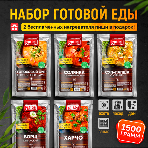 7 вёрст Набор готовых блюд Суп-лапша куриный, Борщ кубанский, Солянка сборная мясная, Гороховый суп, Харчо, Подарок БНП 2 шт .