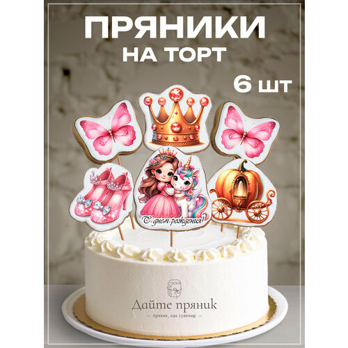 Имбирные пряники на торт для девочки Принцесса с единорогом 6 шт. на день рождения, поздравление девочки
