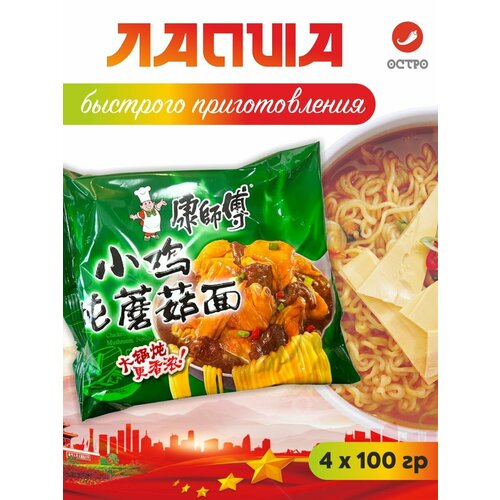 Китайская лапша быстрого приготовления с курицей и грибами упаковка 4 штуки / зеленая