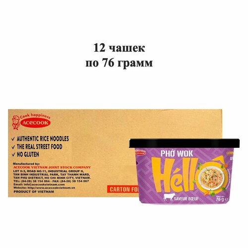 Лапша быстрого приготовления рисовая Hello Rice со вкусом чеснока и лука Acecook, чашка 76 г х 12 шт