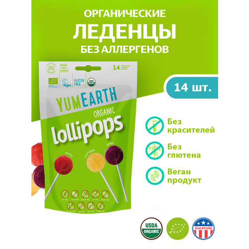 Леденцы на палочке YumEarth Organic Sour Lollipops, органические, без глютена и без аллергенов, только натуральные ингредиенты, веган, ассорти, 14 леденцов