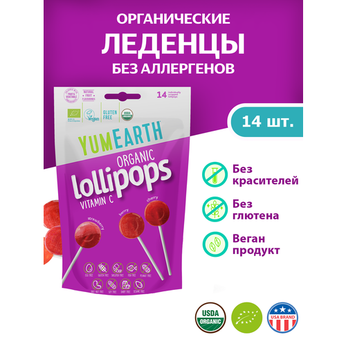 Леденцы на палочке YumEarth Organic Vitamin С Lollipops, органические, без глютена и без аллергенов, только натуральные ингредиенты, веган, ассорти, 14 леденцов