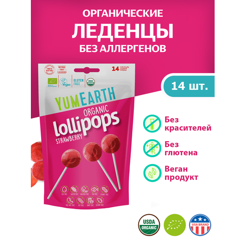 Леденцы на палочке YumEarth Organic Strawberry Lollipops, органические, без глютена и без аллергенов, только натуральные ингредиенты, веган, клубника, 14 леденцов