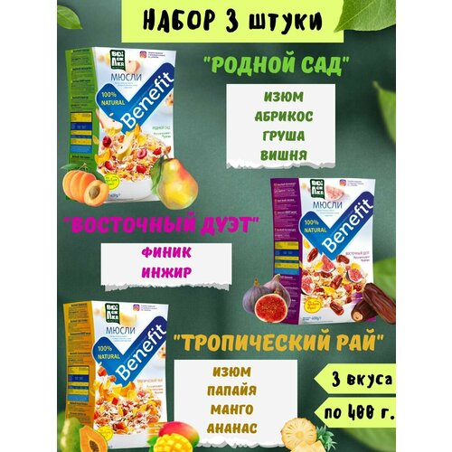 Мюсли Benefit 3шт по 400г (финик, инжир), (изюм, папайя, манго, ананас), (изюм, абрикос, вишня, груша)