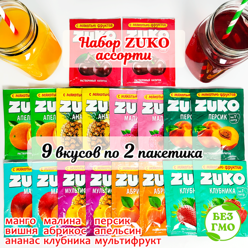 Набор ZUKO Растворимый напиток ЗУКО АССОРТИ (9 вкусов по 2шт) ананас апельсин вишня клубника манго персик мультифрукт абрикос малина. Сухой сок, лимонад в подарок на праздник, в поход, на рыбалку