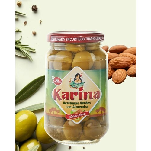 Оливки зеленые с миндалем Karina, 350 г стеклянная банка