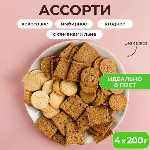 Печенье без сахара, ассорти 4 вкуса, 800г, кокосовое, имбирное, ягодное, с семенами льна, Сладень, полезный перекус