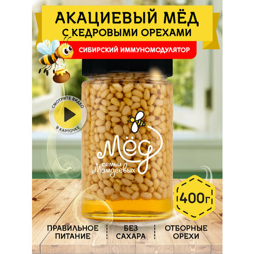 Акациевый мёд с кедровым орехом, 400 г мед с орехами, подарок без сахара