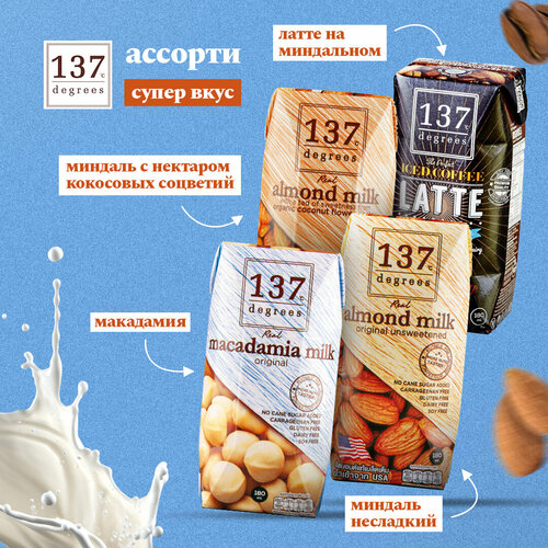 Ассорти напитков 137 Degrees: миндальный без сахара, с нектаром кокосовых соцветий, макадамия с витаминами, кофе латте на растительном молоке, 4 шт по 180 мл