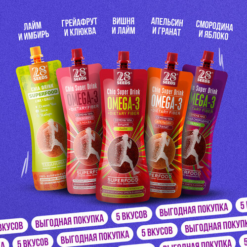 Ассорти напитков Чиа 28SEEDS, без сахара 5 шт. Апельсин/Гранат, Вишня/Лайм, Смородина/Яблоко, Грейпфрут/Клюква, Лайм/Имбирь