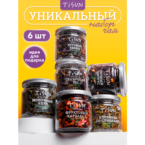 Чай листовой черный и зеленый, набор чая: травяной, каркаде подарочный Tisun ассорти из 6 вкусов