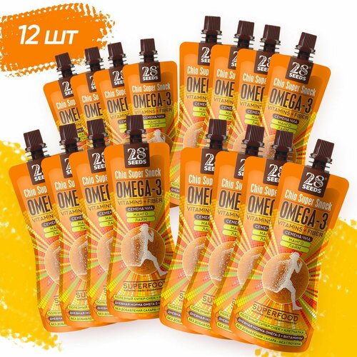 Супер-снек, смузи без сахара Чиа Омега-3 Манго и Лайм 28SEEDS 12 шт, 150 мл, омега 6, клетчатка, протеин, пюре фруктовое, быстрый завтрак