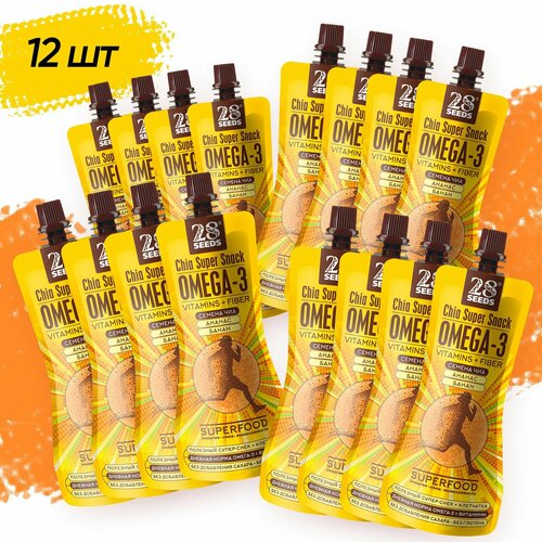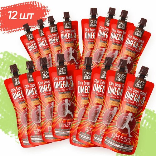 Супер-снек, смузи без сахара Чиа Омега-3 Клубника-Апельсин 28SEEDS 12 шт, 150 мл, омега 6, клетчатка, протеин, пюре фруктовое, быстрый завтрак