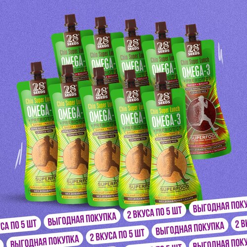 Ассорти Супер-ланчи 28SEEDS Чиа ОМЕГА-3 10 шт: Банан+Манго 5 шт, Банан+Вишня 5 шт