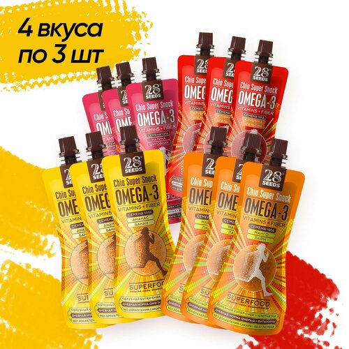 Ассорти Супер-снек 12шт 28 seeds: Клубника-Апельсин, Малина-Шиповник, Ананас-Банан, Манго-Лайм