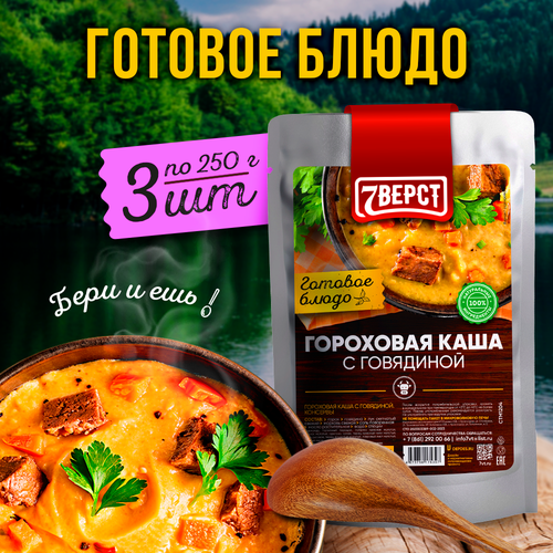 7 вёрст Говядина с гороховой кашей. Готовая еда в реторт-пакете. Консерва в фольге Набор 3 уп. по 250 г