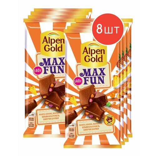 Молочный шоколад Alpen Gold MAX FUN фруктовые кусочки-карамель-шипучие шарики 140г 8шт