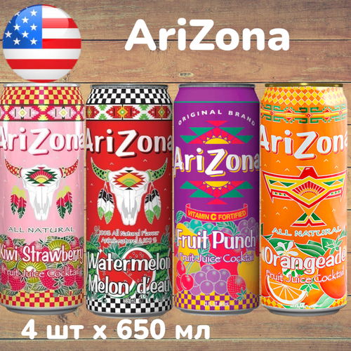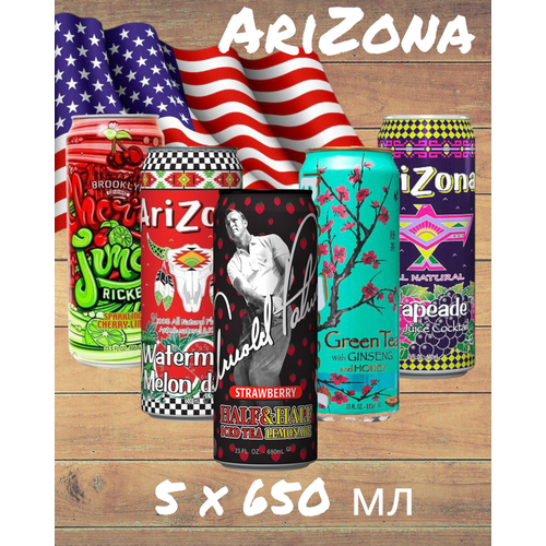 Холодный чай Аризона набор: Вишня, Арбуз, Женьшень и Мед, Арнольд Палмер Клубничный, Виноград, 5 шт по 650 мл, США