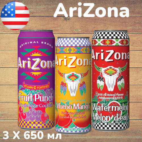 Холодный чай Аризона набор: Фруктовый Пунш, Манго, Арбуз, 3 шт по 650 мл, Америка