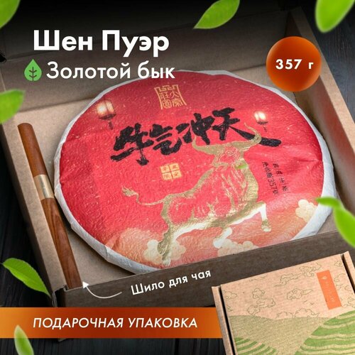 Китайский зеленый листовой Чай Шэн (Шен) Пуэр "Золотой Бык", 357 гр. в Подарочном боксе+Шило Art of Tea