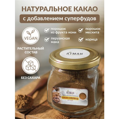 Какао суперфуд, натуральный растворимый какао порошок, premium какао для веганов, ПП продукт без лактозы 40 г. Атман
