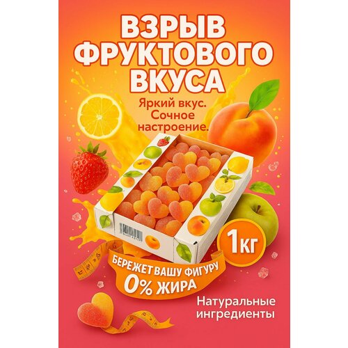 Мармелад жевательный кислый сладкий 1кг, персик и клубника с натуральным соком