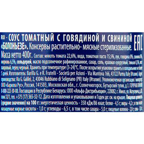 Соус томатный BARILLA Bolognese, с говядиной и свининой, 400г