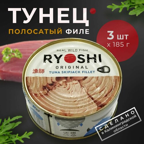 Тунец полосатый филе-ломтики в собственном соку RYOSHI, Барс, 3 шт. по 185 г