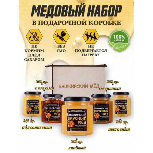 Медовый подарочный набор Башкирский Вкусный мед, в деревянной коробке, со своей пасеки банки 250гр*5шт. Липовый, Цветочный, Подсолнечный, Гречишный, С орехами. Подарок руководителю