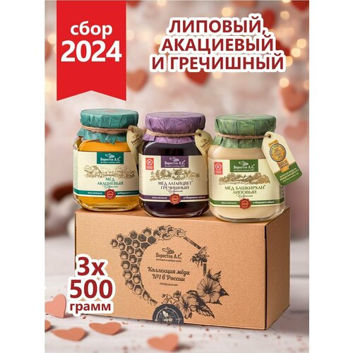 Натуральный мед подарочный набор: Липовый, Акациевый, Гречишный. Берестов А. С, сбор 2024 года