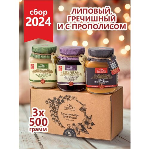 Натуральный мед подарочный набор: Липовый, цветочный с прополисом, Гречишный. Берестов А. С, сбор 2024 года