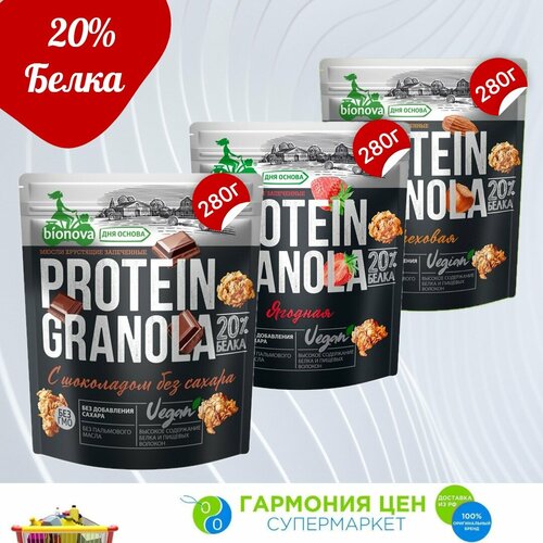 Гранола без сахара протеиновая Bionova, 280 г*2 шт.: "С шоколадом" , "Ягодная"