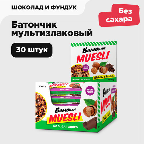 Мюсли батончики Bombbar без сахара Фундук Шоколад, 30шт х 45г