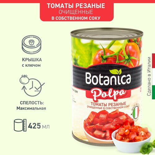 Томаты в собственном соку, резаные, очищенные Botanica, 425 мл