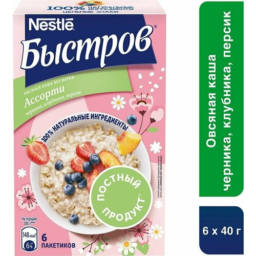 Быстров®. Овсянка по-новому. Хлопья овсяные, не требующие варки,с клубникой, персиком, яблоком, семенами льна и отрубями. 35г (17 пакетиков)