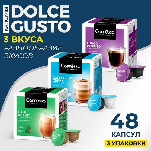 Кофе Coffesso Dolce Gusto (CAFE AU LAIT l, Сappuccino, Lungo), ассорти набор, 3 уп х 16 капсул