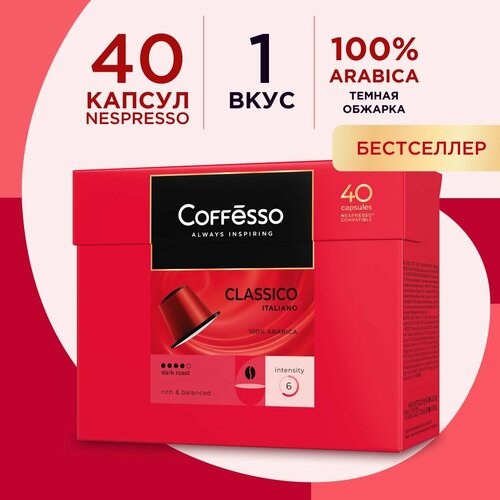 Кофе в капсулах Coffesso подарочный "Classico Italianо", арабика 100%, тёмная обжарка, интенсивность 6, с легкими карамельными нотами, для кофемашины Nespresso- 40 капсул по 5 г.