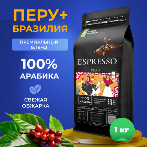 Кофе в зернах 1кг DE JANEIRO (ДЕ жанейро) ESPRESSO PERU 100% Арабика, в упаковке Zip-Lock, кофе зерновой