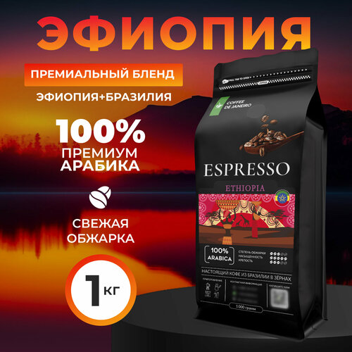 Кофе в зернах 1кг DE JANEIRO (ДЕ жанейро) ESPRESSO ETHIOPIA, 100% Арабика, в упаковке Zip-Lock, кофе зерновой