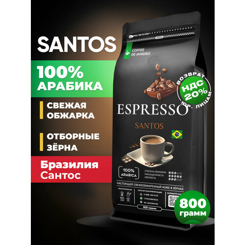 Кофе в зернах Espresso SANTOS 800 г Арабика 100%, свежеобжаренный зерновой кофе DE JANEIRO