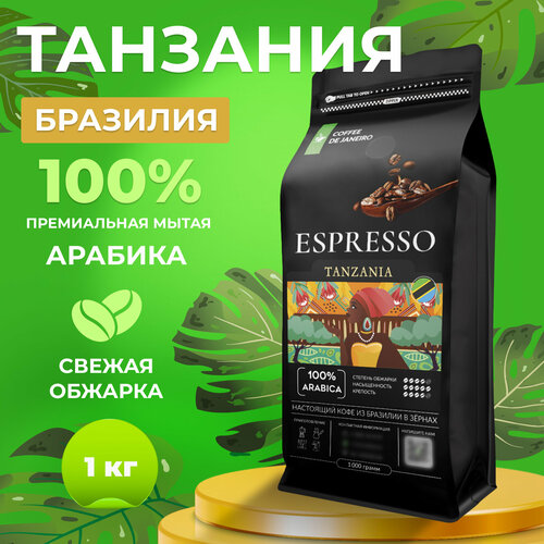 Кофе в зернах 1кг DE JANEIRO (ДЕ жанейро) ESPRESSO TANZANIA, 100% Арабика, в упаковке Zip-Lock, кофе зерновой