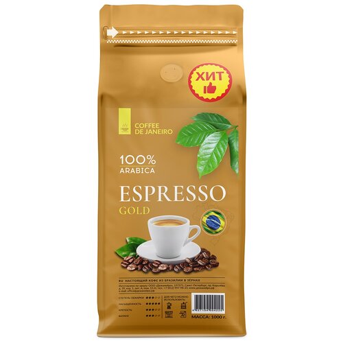 Бразильский кофе в зёрнах DE JANEIRO (Де Жанейро) ESPRESSO GOLD (100% Арабика), 1 кг в упаковке Zip-Lock