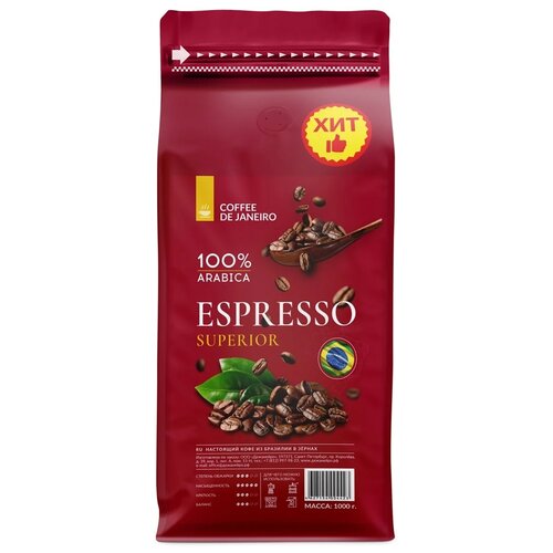 Бразильский кофе в зёрнах DE JANEIRO (Де Жанейро) ESPRESSO SUPERIOR (100% Арабика — Моджиана), 1кг в упаковке Zip-Lock / Зерновой кофе 1 кг