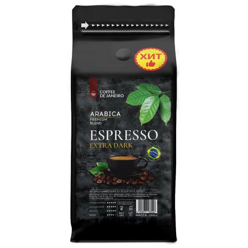 Бразильский кофе в зёрнах DE JANEIRO (Де Жанейро) ESPRESSO EXTRA DARK (Арабика / Робуста), 1 кг в упаковке Zip-Lock