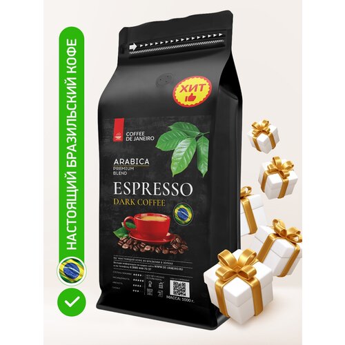 Бразильский кофе в зёрнах DE JANEIRO (Де Жанейро) ESPRESSO DARK (Арабика / Робуста), 1кг в упаковке Zip-Lock / Зерновой кофе 1 кг