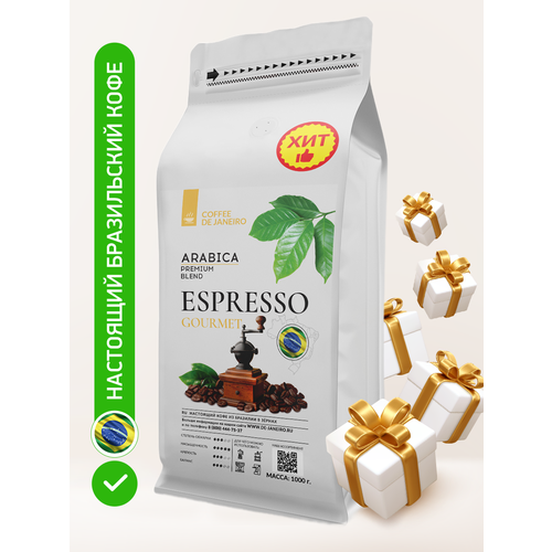 Бразильский кофе в зёрнах DE JANEIRO (Де Жанейро) ESPRESSO GOURMET (Арабика / Робуста), 1кг в упаковке Zip-Lock / Зерновой кофе 1 кг