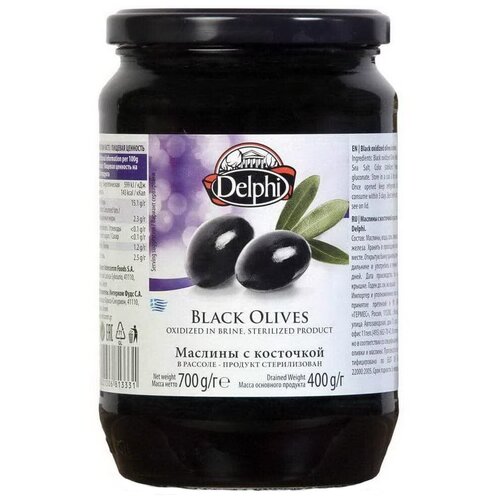 Маслины б/к в рассоле DELPHI 700 г ст/б BLACK OXIDIZED PITTED OLIVES (BLACK OLIVES THIRD COUNTRY ORIGIN) IN 720ML JARS 370G ATLAS 71/90
