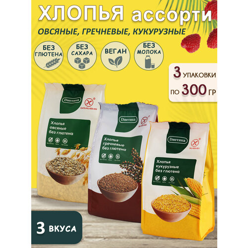 Хлопья овсяные, гречневые, кукурузные, Диетика, 300 гр( 3 шт в наборе)